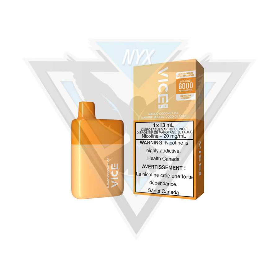 Introducing the VICE BOX DISPOSABLE - MANGO COCONUT ICE, a disposable vape device that offers unparalleled convenience, exceptional performance, and an explosion of delightful flavours. With an impressive puff count of up to 6000 puffs, this disposable device ensures a long-lasting and satisfying vaping experience without the need for refills. The generous 13mL e-liquid capacity guarantees extended enjoyment, allowing you to indulge in a tropical delight that combines the sweetness of mango and the creaminess of coconut with a refreshing icy twist,that will leave your taste buds craving for more.