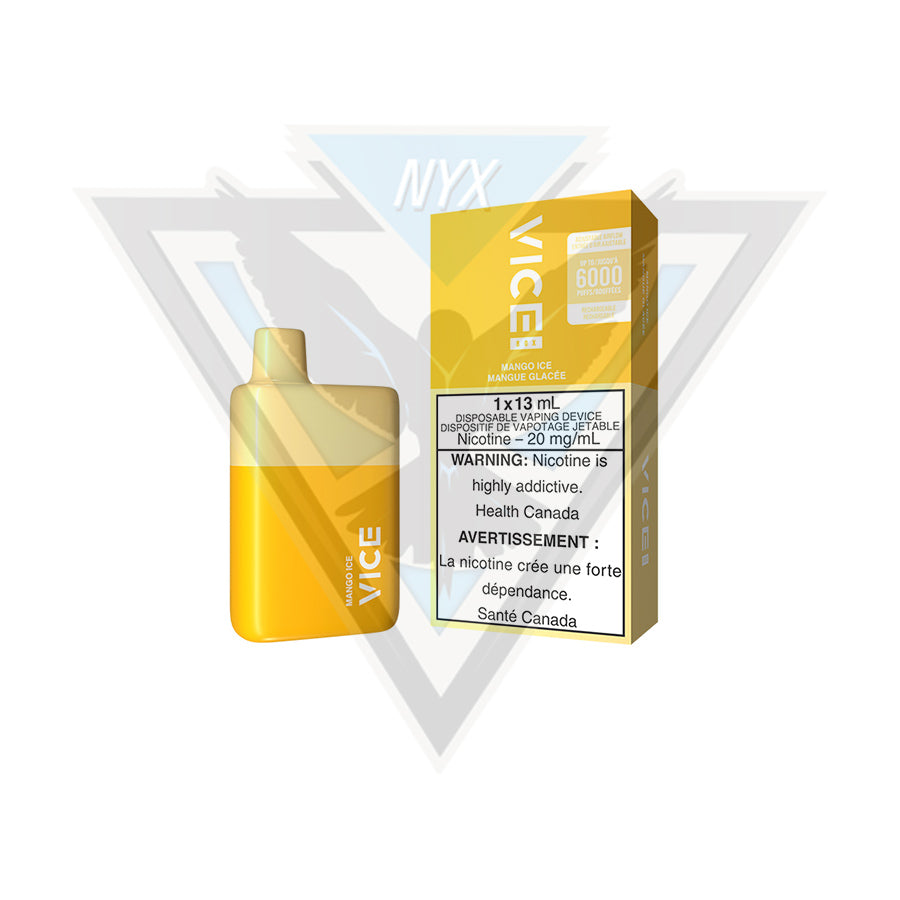 VICE BOX DISPOSABLE - MANGO ICE is a rechargeable disposable vape delivering up to 6000 puffs. Pre-filled with 13mL of e-liquid at 20mg nicotine strength, it combines the sweetness of ripe mango with a crisp icy finish for a smooth fruit-and-ice profile.